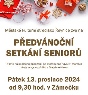 V pátek 13.12.2024 v 9.30 hodin proběhne tradiční předvánoční setkání seniorů v Zámečku, kde ani letos nebude chybět vystoupení dětí z MŠ Řevnice.