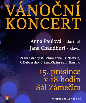 15.12.2024 můžete navštívit vánoční koncert pro klavír a klarinet, a to od 18.00 hodin v sále Zámečku. Vstupné 200 Kč/100 Kč